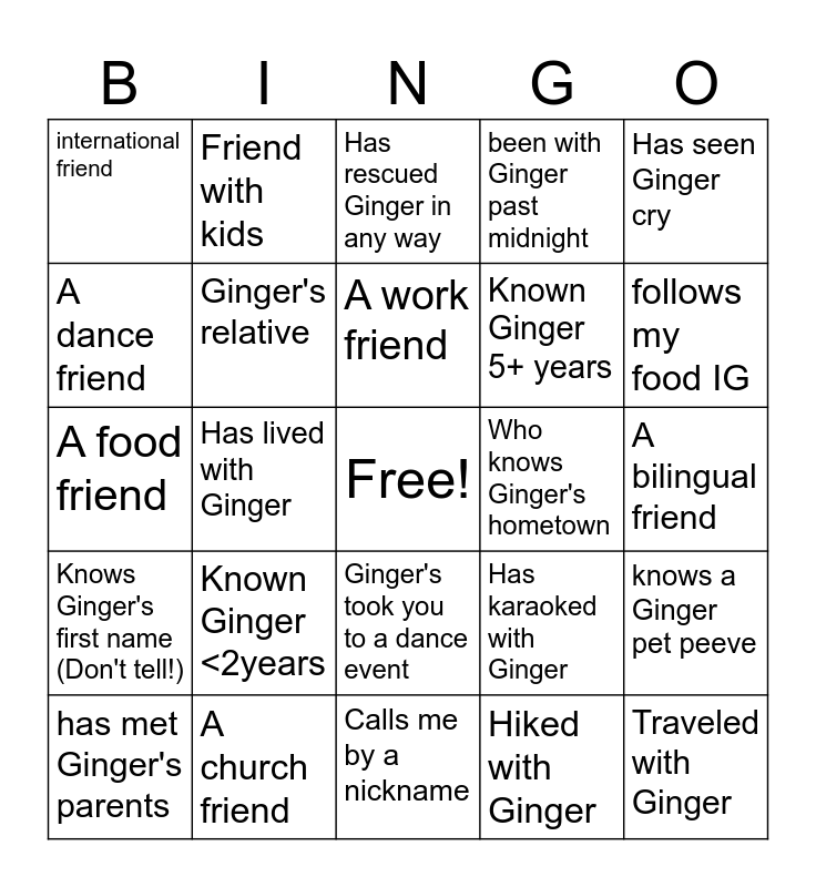 This bingo card has a free space and 24 words: Known Ginger <2years, A church friend, A work friend, has met Ginger's parents, Has seen Ginger cry, international friend, A dance friend, Friend with kids, Who knows Ginger's hometown, Ginger's took you to a dance event, Known Ginger 5+ years, A food friend, Has karaoked with Ginger, knows a Ginger pet peeve, Ginger's relative, Hiked with Ginger, A bilingual friend, Has rescued Ginger in any way, follows my food IG, Has lived with Ginger, Traveled with Ginger, Knows Ginger's first name (Don't tell!), been with Ginger past midnight and Calls me by a nickname.