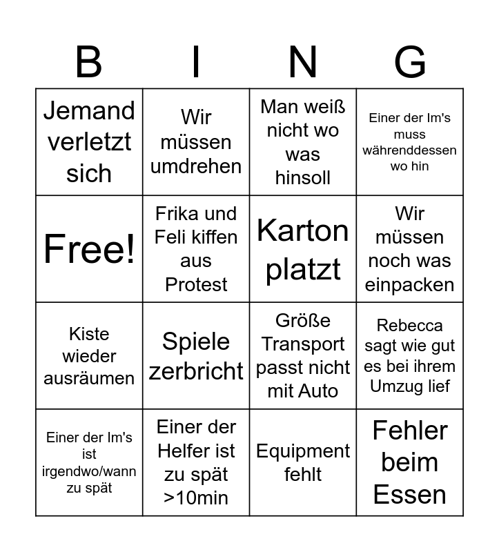This bingo card has 16 words: Einer der Helfer ist zu spät >10min, Rebecca sagt wie gut es bei ihrem Umzug lief, Man weiß nicht wo was hinsoll, Jemand verletzt sich, Kiste wieder ausräumen, Wir müssen umdrehen, Größe Transport passt nicht mit Auto, Equipment fehlt, Free!, Frika und Feli kiffen aus Protest, Einer der Im's ist irgendwo/wann zu spät, Einer der Im's muss währenddessen wo hin, Spiele zerbricht, Wir müssen noch was einpacken, Karton platzt and Fehler beim Essen.
