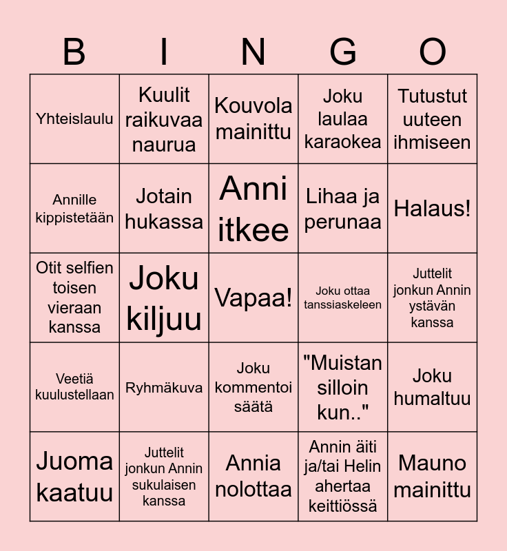 This bingo card has a free space and 24 words: Ryhmäkuva, Juttelit jonkun Annin sukulaisen kanssa, Anni itkee, Juoma kaatuu, Tutustut uuteen ihmiseen, Yhteislaulu, Annille kippistetään, Kuulit raikuvaa naurua, Joku ottaa tanssiaskeleen, Joku kommentoi säätä, Lihaa ja perunaa, Otit selfien toisen vieraan kanssa, "Muistan silloin kun..", Joku humaltuu, Jotain hukassa, Annin äiti ja/tai Helin ahertaa keittiössä, Juttelit jonkun Annin ystävän kanssa, Kouvola mainittu, Halaus!, Joku kiljuu, Mauno mainittu, Veetiä kuulustellaan, Joku laulaa karaokea and Annia nolottaa.