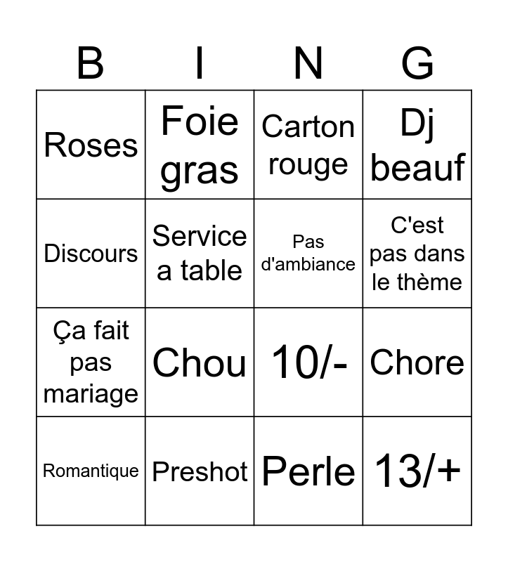 This bingo card has 16 words: Preshot, Chore, Carton rouge, Roses, Ça fait pas mariage, Foie gras, 10/-, Perle, Discours, Service a table, Romantique, Dj beauf, Chou, C'est pas dans le thème, Pas d'ambiance and 13/+.