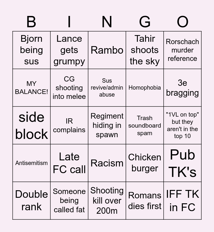 This bingo card has 25 words: Late FC call, Shooting kill over 200m, Sus revive/admin abuse, Double rank, Rorschach murder reference, Bjorn being sus, MY BALANCE!, Lance gets grumpy, Trash soundboard spam, Racism, Homophobia, side block, Chicken burger, Pub TK's, CG shooting into melee, IFF TK in FC, "1VL on top" but they aren't in the top 10, Rambo, 3e bragging, IR complains, Regiment hiding in spawn, Someone being called fat, Antisemitism, Tahir shoots the sky and Romans dies first.
