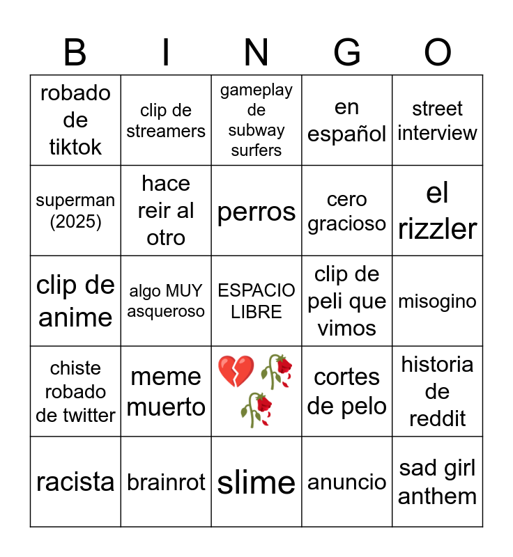 This bingo card has a free space and 24 words: meme muerto, brainrot, perros, racista, street interview, robado de tiktok, superman (2025), clip de streamers, clip de peli que vimos, ππ₯π₯, cero gracioso, clip de anime, cortes de pelo, historia de reddit, hace reir al otro, anuncio, misogino, gameplay de subway surfers, el rizzler, algo MUY asqueroso, sad girl anthem, chiste robado de twitter, en espaΓ±ol and slime.