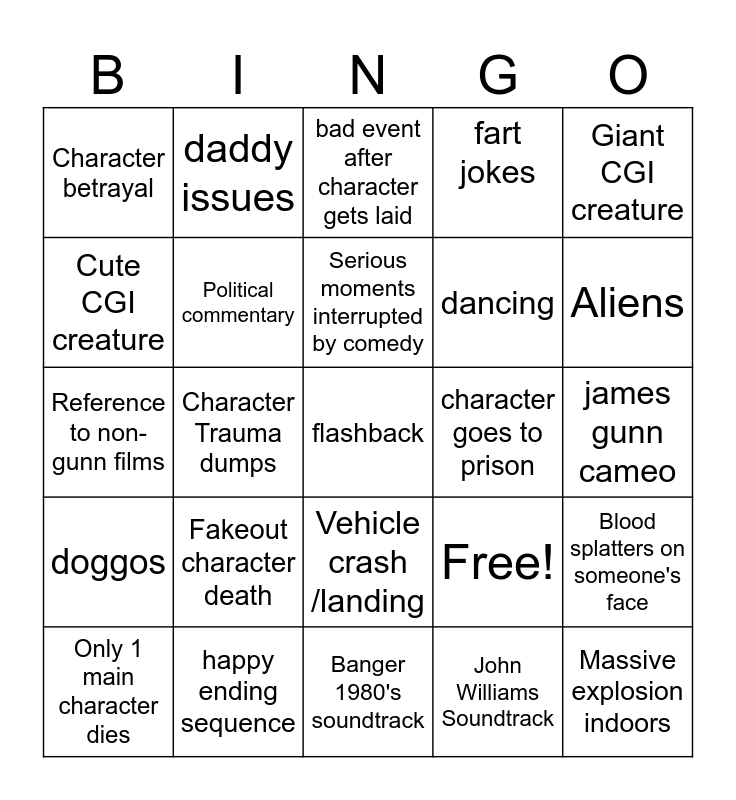This bingo card has 25 words: Fakeout character death, Banger 1980's soundtrack, Serious moments interrupted by comedy, Only 1 main character dies, Giant CGI creature, Character betrayal, Cute CGI creature, daddy issues, character goes to prison, Vehicle crash /landing, dancing, Reference to non-gunn films, Free!, Blood splatters on someone's face, Political commentary, Massive explosion indoors, james gunn cameo, bad event after character gets laid, Aliens, Character Trauma dumps, flashback, happy ending sequence, doggos, fart jokes and John Williams Soundtrack.