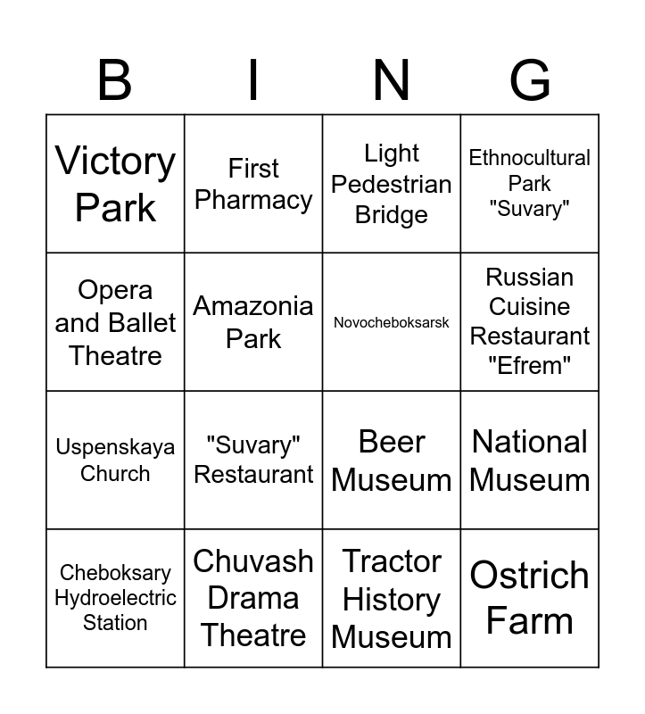 This bingo card has 16 words: Chuvash Drama Theatre, National Museum, Light Pedestrian Bridge, Victory Park, Uspenskaya Church, First Pharmacy, Beer Museum, Tractor History Museum, Opera and Ballet Theatre, Amazonia Park, Cheboksary Hydroelectric Station, Ethnocultural Park "Suvary", "Suvary" Restaurant, Russian Cuisine Restaurant "Efrem", Novocheboksarsk and Ostrich Farm.