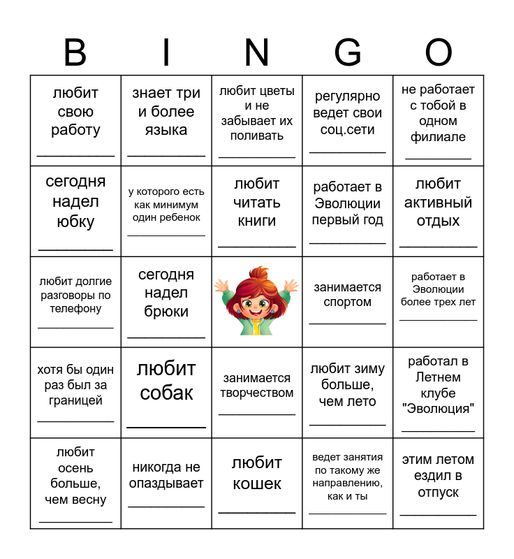 This bingo card has a free space and 24 words: любит собак _______, никогда не опаздывает __________, любит читать книги _________, любит осень больше, чем весну __________, не работает с тобой в одном филиале _________, любит свою работу _________, сегодня надел юбку ________, знает три и более языка _________, занимается спортом ___________, занимается творчеством ___________, работает в Эволюции первый год __________, любит долгие разговоры по телефону ____________, любит зиму больше, чем лето __________, работал в Летнем клубе "Эволюция" __________, у которого есть как минимум один ребенок _____________, ведет занятия по такому же направлению, как и ты _____________, работает в Эволюции более трех лет _____________, любит цветы и не забывает их поливать ___________, любит активный отдых _________, сегодня надел брюки _________, этим летом ездил в отпуск __________, хотя бы один раз был за границей ___________, регулярно ведет свои соц.сети __________ and любит кошек ________.