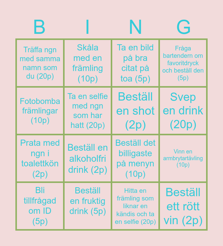 This bingo card has 16 words: Bli tillfrågad om ID (5p), Beställ en fruktig drink (5p), Ta en bild på bra citat på toa (5p), Fråga bartendern om favoritdryck och beställ den (5p), Fotobomba främlingar (10p), Skåla med en främling (10p), Beställ det billigaste på menyn (10p), Vinn en armbrytartävling (10p), Träffa ngn med samma namn som du (20p), Ta en selfie med ngn som har hatt (20p), Hitta en främling som liknar en kändis och ta en selfie (20p), Svep en drink (20p), Prata med ngn i toalettkön (2p), Beställ en alkoholfri drink (2p), Beställ en shot (2p) and Beställ ett rött vin (2p).