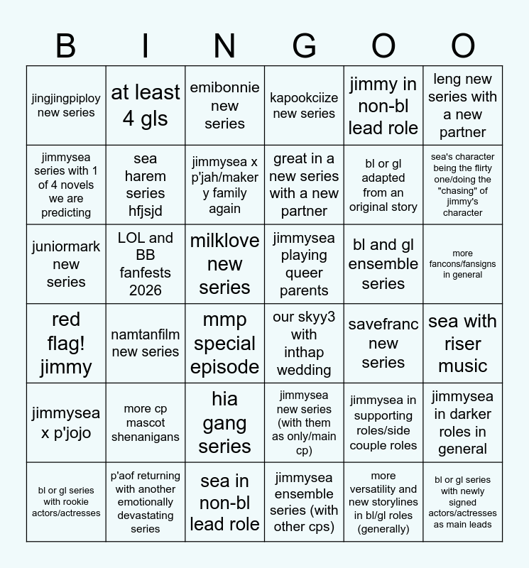 This bingo card has 36 words: jimmysea new series (with them as only/main cp), hia gang series, jimmysea ensemble series (with other cps), jimmysea series with 1 of 4 novels we are predicting, red flag! jimmy, jimmysea playing queer parents, sea harem series hfjsjd, sea in non-bl lead role, jimmy in non-bl lead role, jimmysea in supporting roles/side couple roles, sea's character being the flirty one/doing the "chasing" of jimmy's character, kapookciize new series, jimmysea in darker roles in general, LOL and BB fanfests 2026, great in a new series with a new partner, jingjingpiploy new series, jimmysea x p'jojo, bl and gl ensemble series, juniormark new series, emibonnie new series, milklove new series, namtanfilm new series, our skyy3 with inthap wedding, mmp special episode, savefranc new series, at least 4 gls, bl or gl adapted from an original story, p'aof returning with another emotionally devastating series, jimmysea x p'jah/maker y family again, leng new series with a new partner, bl or gl series with newly signed actors/actresses as main leads, bl or gl series with rookie actors/actresses, sea with riser music, more fancons/fansigns in general, more cp mascot shenanigans and more versatility and new storylines in bl/gl roles (generally).