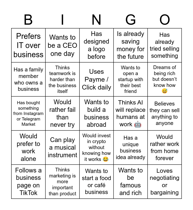 This bingo card has 25 words: Can play a musical instrument, Wants to start a food or café business, Uses Payme / Click daily, Follows a business page on TikTok, Has already tried selling something, Prefers IT over business, Has a family member who owns a business, Wants to be a CEO one day, Thinks AI will replace humans at work 🤖, Would invest in crypto without knowing how it works 😂, Wants to open a startup with their best friend, Has bought something from Instagram or Telegram Market, Has a unique business idea already, Would rather work from home forever, Thinks teamwork is harder than the business itself, Loves negotiating or bargaining, Believes they can sell anything to anyone, Has designed a logo before, Dreams of being rich but doesn’t know how 😅, Would rather fail than never try, Wants to build a business abroad, Thinks marketing is more important than product, Would prefer to work alone, Is already saving money for the future and Wants to be famous and rich.