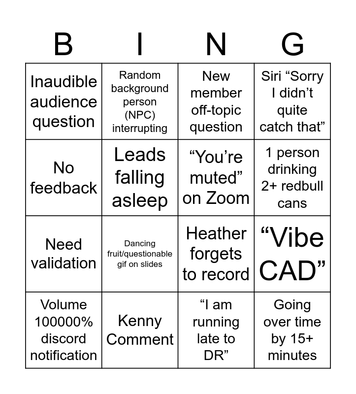 This bingo card has 16 words: Kenny Comment, “Vibe CAD”, New member off-topic question, Inaudible audience question, Need validation, Random background person (NPC) interrupting, Heather forgets to record, “I am running late to DR”, No feedback, Leads falling asleep, Volume 100000% discord notification, Siri “Sorry I didn’t quite catch that”, Dancing fruit/questionable gif on slides, 1 person drinking 2+ redbull cans, “You’re muted” on Zoom and Going over time by 15+ minutes.