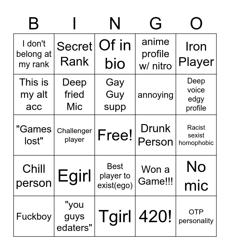 This bingo card has a free space and 24 words: Egirl, "you guys edaters", Gay Guy supp, Fuckboy, Iron Player, I don't belong at my rank, This is my alt acc, Secret Rank, Drunk Person, Best player to exist(ego), annoying, "Games lost", Won a Game!!!, No mic, Deep fried Mic, 420!, Racist sexist homophobic, Of in bio, Deep voice edgy profile, Challenger player, OTP personality, Chill person, anime profile w/ nitro and Tgirl.