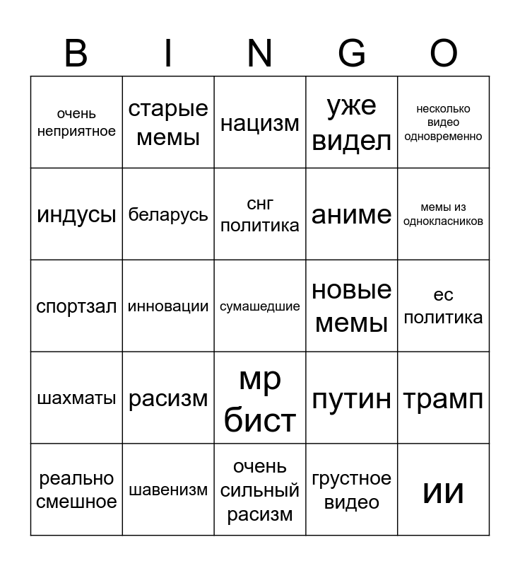 This bingo card has a free space and 24 words: расизм, шавенизм, снг политика, реально смешное, несколько видео одновременно, очень неприятное, индусы, старые мемы, новые мемы, мр бист, аниме, спортзал, путин, трамп, беларусь, грустное видео, ес политика, нацизм, мемы из однокласников, инновации, ии, шахматы, уже видел and очень сильный расизм.