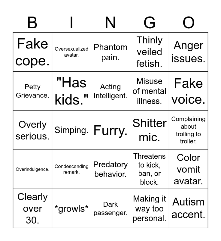 This bingo card has a free space and 24 words: Condescending remark., *growls*, Acting Intelligent., Clearly over 30., Anger issues., Fake cope., Petty Grievance., Oversexualized avatar., Shitter mic., Predatory behavior., Misuse of mental illness., Overly serious., Threatens to kick, ban, or block., Color vomit avatar., "Has kids.", Making it way too personal., Complaining about trolling to troller., Phantom pain., Fake voice., Simping., Autism accent., Overindulgence., Thinly veiled fetish. and Dark passenger..