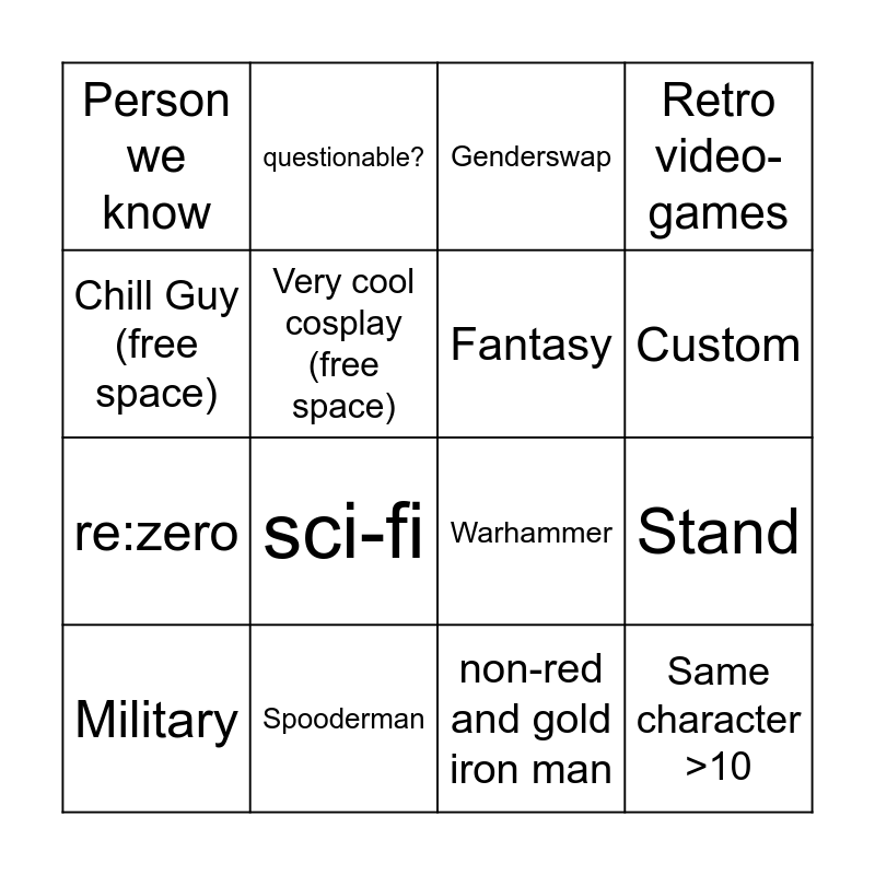 This bingo card has 16 words: Spooderman, Stand, Genderswap, Person we know, re:zero, questionable?, Warhammer, non-red and gold iron man, Chill Guy (free space), Very cool cosplay (free space), Military, Retro video-games, sci-fi, Custom, Fantasy and Same character >10.