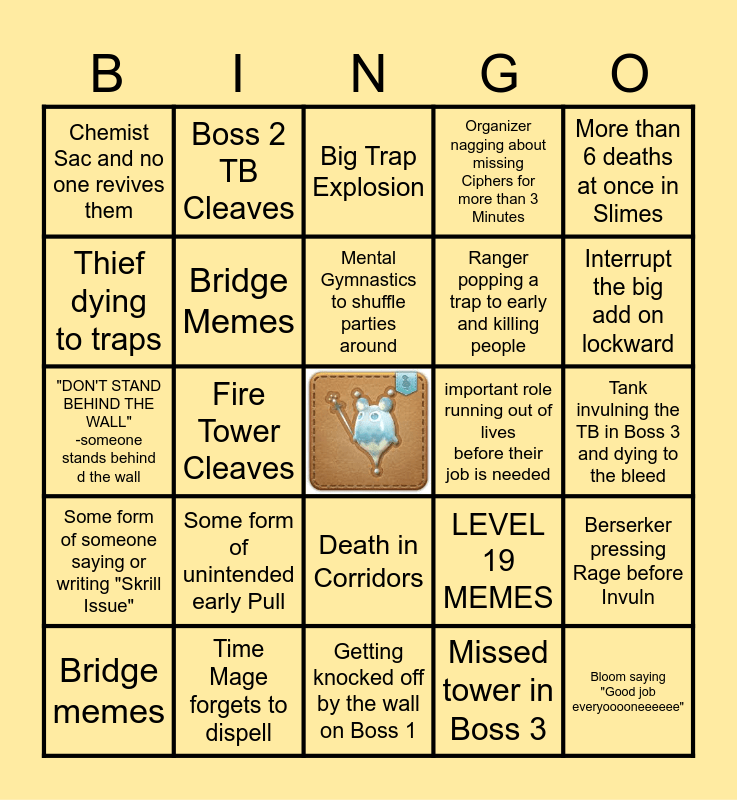 This bingo card has a free space and 26 words: Death in Corridors, Missed tower in Boss 3, Mental Gymnastics to shuffle parties around, Time Mage forgets to dispell, More than 6 deaths at once in Slimes, Chemist Sac and no one revives them, Thief dying to traps, Boss 2 TB Cleaves, Tank invulning the TB in Boss 3 and dying to the bleed, LEVEL 19 MEMES, Ranger popping a trap to early and killing people, "DON'T STAND BEHIND THE WALL" -someone stands behind d the wall, Berserker pressing Rage before Invuln, Bridge memes, Fire Tower Cleaves, Someone saying to not nuke the fates, Organizer nagging about missing Ciphers for more than 3 Minutes, Some form of someone saying or writing "Skrill Issue", Big Trap Explosion, Bloom saying "Good job everyooooneeeeee", Interrupt the big add on lockward, Getting knocked off by the wall on Boss 1, important role running out of lives before their job is needed, Some form of unintended early Pull, Bridge Memes and Snowball Memes.