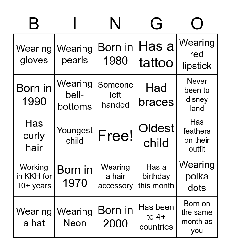 This bingo card has a free space and 24 words: Born in 1970, Wearing Neon, Someone left handed, Wearing a hat, Wearing red lipstick, Wearing gloves, Born in 1990, Wearing pearls, Oldest child, Wearing a hair accessory, Had braces, Has curly hair, Has a birthday this month, Wearing polka dots, Wearing bell- bottoms, Has been to 4+ countries, Has feathers on their outfit, Born in 1980, Never been to disney land, Youngest child, Born on the same month as you, Working in KKH for 10+ years, Has a tattoo and Born in 2000.