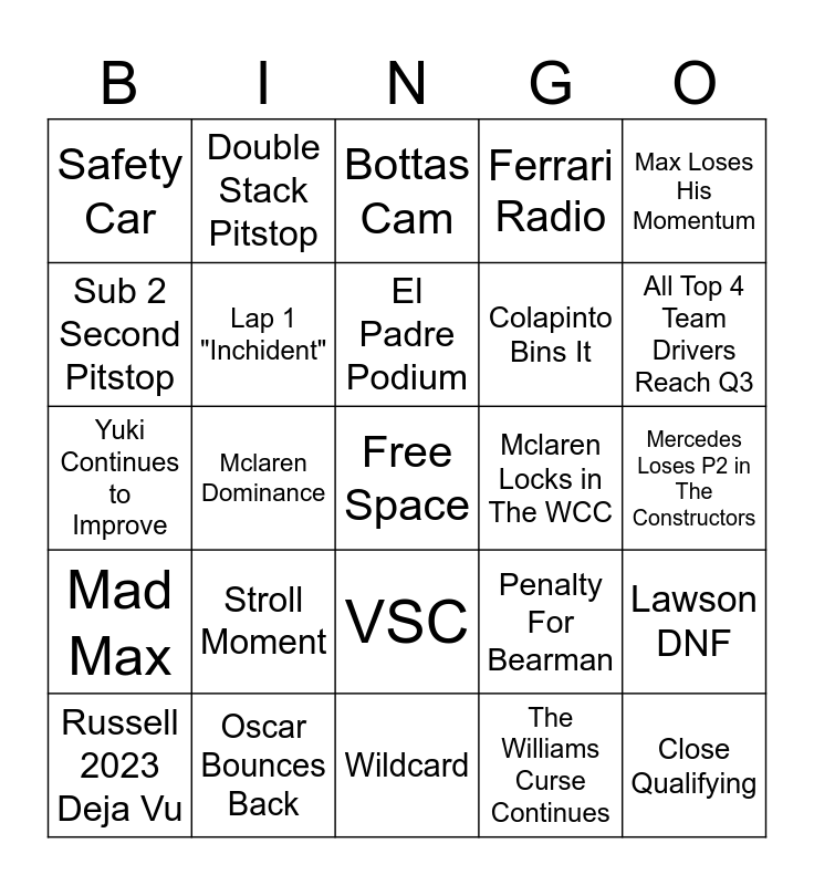 This bingo card has a free space and 24 words: Stroll Moment, Oscar Bounces Back, El Padre Podium, Russell 2023 Deja Vu, Max Loses His Momentum, Safety Car, Sub 2 Second Pitstop, Double Stack Pitstop, Mclaren Locks in The WCC, VSC, Colapinto Bins It, Yuki Continues to Improve, Penalty For Bearman, Lawson DNF, Lap 1 "Inchident", The Williams Curse Continues, Mercedes Loses P2 in The Constructors, Bottas Cam, All Top 4 Team Drivers Reach Q3, Mclaren Dominance, Close Qualifying, Mad Max, Ferrari Radio and Wildcard.