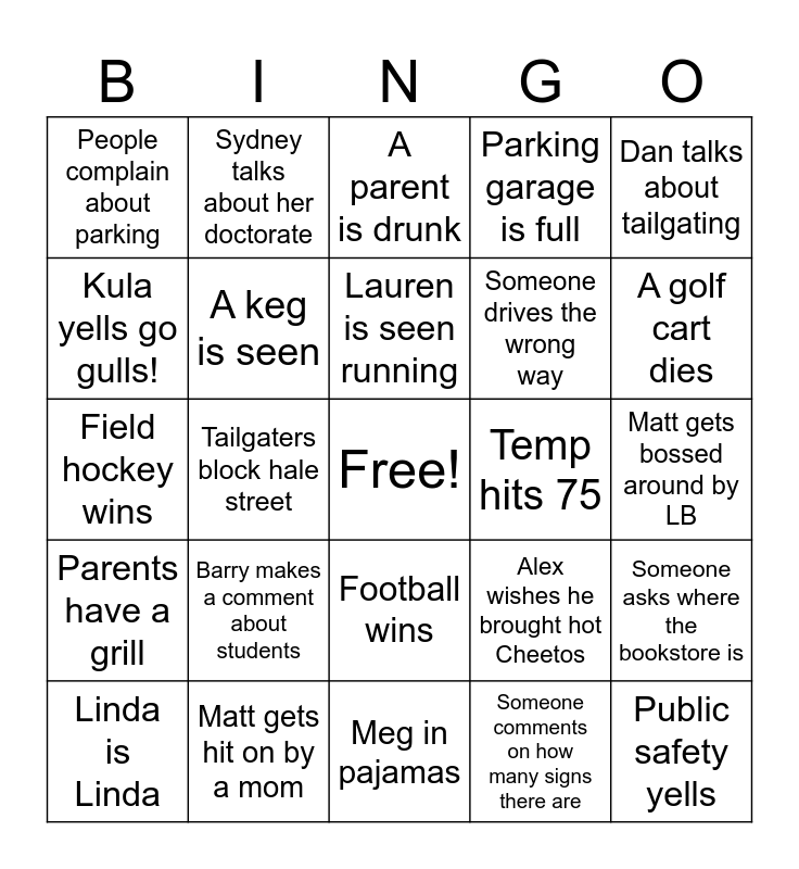 This bingo card has a free space and 24 words: Linda is Linda, Barry makes a comment about students, Lauren is seen running, Someone comments on how many signs there are, Dan talks about tailgating, People complain about parking, Sydney talks about her doctorate, A parent is drunk, Temp hits 75, Matt gets bossed around by LB, Field hockey wins, A keg is seen, Alex wishes he brought hot Cheetos, Someone asks where the bookstore is, Kula yells go gulls!, Matt gets hit on by a mom, Meg in pajamas, Parking garage is full, A golf cart dies, Parents have a grill, Tailgaters block hale street, Football wins, Someone drives the wrong way and Public safety yells.