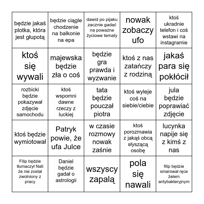 This bingo card has a free space and 24 words: Patryk powie, że ufa Julce, Daniel będzie gadał o astrologii, będzie gra prawda i wyzwanie, Filip będzie tłumaczył Nati że nie został zwolniony z pracy, ktoś ukradnie telefon i coś wstawi na instagramie, będzie jakaś plotka, która jest głupotą, ktoś się wywali, będzie ciągle chodzenie na balkonie na epa, ktoś wyleje coś na siebie/ciebie, w czasie rozmowy nowak zaśnie, ktoś z nas zatańczy z rodziną, rozbicki będzie pokazywał zdjęcie samochodu, ktoś porozmawia z jakąś obcą słyszącą osobę, lucynka napije się z kimś z nas, majewska będzie zła o coś, pola się nawali, jula będzie poprawiać zdjęcie, dawid po pijaku zacznie gadać na poważne życiowe tematy, jakaś para się pokłócił, ktoś wspomni dawne rzeczy z luckiej, filip będzie smarował ręce żelem antybakteryjnym, ktoś będzie wymiotował, nowak zobaczy ufo and wszyscy zapalą.