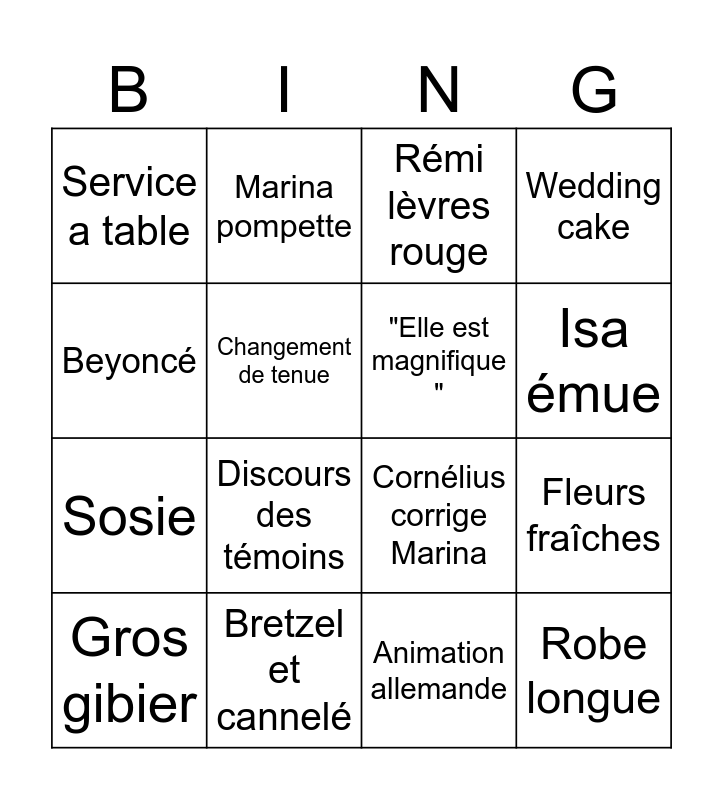 This bingo card has 16 words: Bretzel et cannelé, Fleurs fraîches, Rémi lèvres rouge, Service a table, Sosie, Marina pompette, Cornélius corrige Marina, Animation allemande, Beyoncé, Changement de tenue, Gros gibier, Wedding cake, Discours des témoins, Isa émue, "Elle est magnifique " and Robe longue.