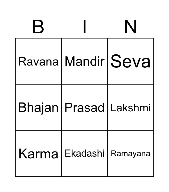 This bingo card has a free space and 11 words: Aarti, Pandavas, Lakshmi, Karma, Seva, Ravana, Ekadashi, Bhagavad Gita, Bhajan, Mandir and Ramayana.
