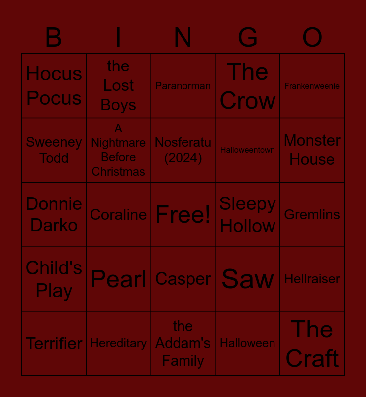 This bingo card has a free space and 49 words: Beetlejuice, The Craft, It, the Addam's Family, Pearl, Labyrnth, the Lost Boys, Edward Scissorhands, Sweeney Todd, Corpse Bride, A Nightmare Before Christmas, The Crow, Hellraiser, Saw, Friday the 13th, A Nightmare on Elm Street, Nosferatu (2024), Sleepy Hollow, Dracula, Frankenweenie, Coraline, Halloween, Hocus Pocus, Halloweentown, The Exorcist, Monster House, Terrifier, Insidious, Casper, Child's Play, the Texas Chainsaw Massacre, the Rocky Horror Picture Show, Elvira, Jennifer's Body, Hereditary, Fear Street, Scream, The Shining, Gremlins, Carrie, 28 Days Later, Psycho, Shaun of the Dead, The Ring, Donnie Darko, Paranorman, Hotel Transylvania, Little Shop of Horrors and Goosebumps.