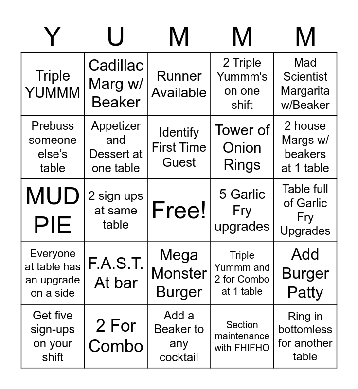 This bingo card has a free space and 24 words: F.A.S.T. At bar, 2 For Combo, Identify First Time Guest, Get five sign-ups on your shift, Mad Scientist Margarita w/Beaker, Triple YUMMM, Prebuss someone else’s table, Cadillac Marg w/ Beaker, 5 Garlic Fry upgrades, Mega Monster Burger, Tower of Onion Rings, MUD PIE, Triple Yummm and 2 for Combo at 1 table, Add Burger Patty, Appetizer and Dessert at one table, Section maintenance with FHIFHO, Table full of Garlic Fry Upgrades, Runner Available, 2 house Margs w/ beakers at 1 table, 2 sign ups at same table, Ring in bottomless for another table, Everyone at table has an upgrade on a side, 2 Triple Yummm's on one shift and Add a Beaker to any cocktail.