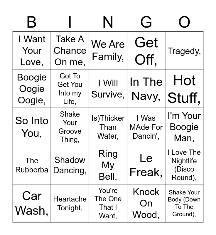 This bingo card has 50 words: Free!, Is)Thicker Than Water,, Emotion,, You're The One That I Want,, Shadow Dancing,, On Broadway,, Take A Chance On me,, The Groove Line,, Boogie Oogie Oogie,, An Everlasting Love, Shame,, Got To Get You Into my Life,, Get Off,, I Love The Nightlife (Disco Round),, Le Freak,, September,, Fire,, I Will Survive,, I Was MAde For Dancin',, Got To Be Real,, Tragedy,, Shake Your Groove Thing,, Knock On Wood,, I Want Your Love,, In The Navy,, He's The Greatest Dancer,, Shake Your Body (Down To The Ground),, Hot Stuff,, Love You Inside Out,, We Are Family,, Ring My Bell,, Boogie Wonderland,, Bad Girls,, You Can't Change That,, Sail On,, Heartache Tonight,, I Wanna Be Your Lover,, Stomp,, One Fine Day,, Best Of My Love,, I'm Your Boogie Man,, Dancing Queen,, You Make Me Feel Like Dancing,, Whatcha Gonna Do?,, Got To Give It Up,, Car Wash,, So Into You,, Dazz,, keep It Comin' Love,, The Rubberba and Boogie Nights..