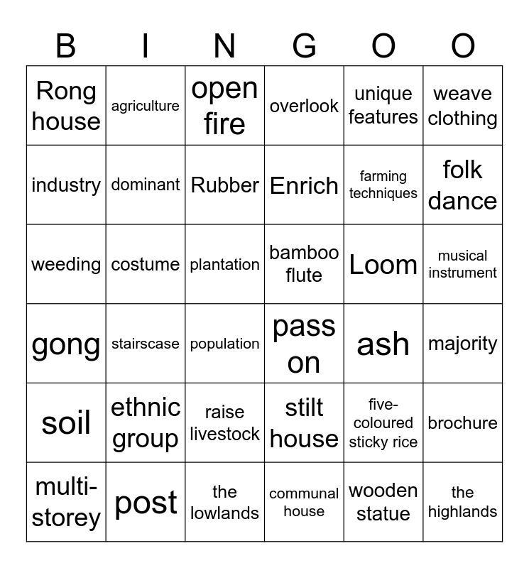 This bingo card has 36 words: stilt house, raise livestock, communal house, industry, gong, bamboo flute, dominant, the lowlands, unique features, five-coloured sticky rice, folk dance, overlook, brochure, costume, Enrich, Rong house, soil, Loom, weeding, open fire, plantation, stairscase, pass on, population, ash, agriculture, farming techniques, post, Rubber, weave clothing, the highlands, multi-storey, majority, musical instrument, ethnic group and wooden statue.