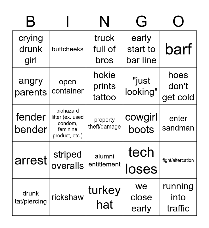 This bingo card has 25 words: striped overalls, turkey hat, hokie prints tattoo, drunk tat/piercing, barf, crying drunk girl, angry parents, buttcheeks, cowgirl boots, alumni entitlement, "just looking", fender bender, tech loses, fight/altercation, open container, running into traffic, enter sandman, truck full of bros, hoes don't get cold, biohazard litter (ex. used condom, feminine product, etc.), property theft/damage, rickshaw, arrest, early start to bar line and we close early.