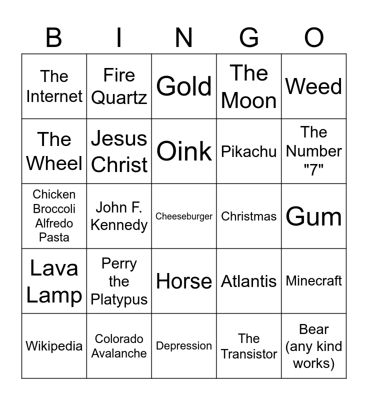 This bingo card has a free space and 24 words: Perry the Platypus, Colorado Avalanche, Oink, Wikipedia, Weed, The Internet, The Wheel, Fire Quartz, Christmas, Horse, Pikachu, Chicken Broccoli Alfredo Pasta, Atlantis, Minecraft, Jesus Christ, The Transistor, Gum, Gold, The Number "7", John F. Kennedy, Bear (any kind works), Lava Lamp, The Moon and Depression.