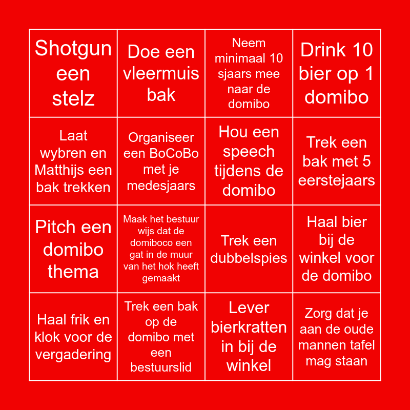 This bingo card has 16 words: Trek een bak op de domibo met een bestuurslid, Haal bier bij de winkel voor de domibo, Neem minimaal 10 sjaars mee naar de domibo, Shotgun een stelz, Pitch een domibo thema, Doe een vleermuis bak, Trek een dubbelspies, Lever bierkratten in bij de winkel, Laat wybren en Matthijs een bak trekken, Organiseer een BoCoBo met je medesjaars, Haal frik en klok voor de vergadering, Drink 10 bier op 1 domibo, Maak het bestuur wijs dat de domiboco een gat in de muur van het hok heeft gemaakt, Trek een bak met 5 eerstejaars, Hou een speech tijdens de domibo and Zorg dat je aan de oude mannen tafel mag staan.