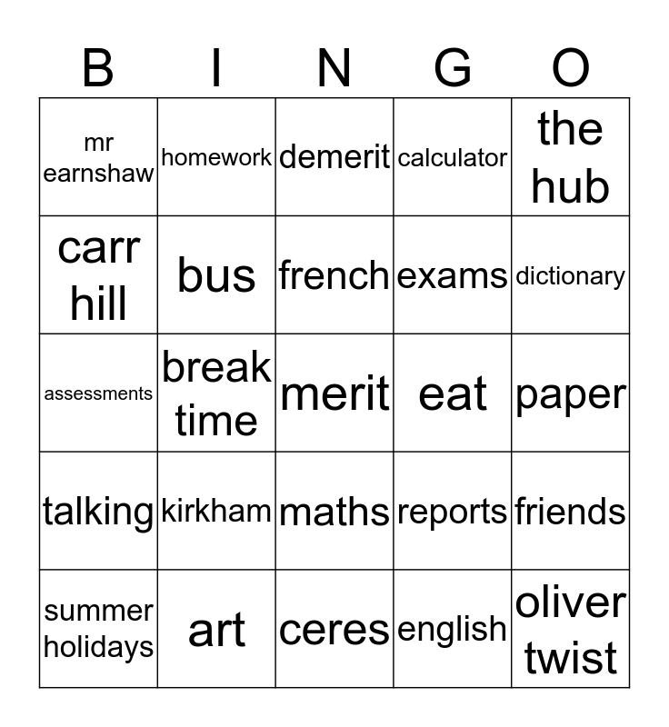 This bingo card has 26 words: maths, english, french, art, the hub, mr earnshaw, carr hill, homework, paper, reports, exams, assessments, friends, summer holidays, break time, geography, calculator, talking, demerit, merit, dictionary, ceres, eat, kirkham, bus and oliver twist.