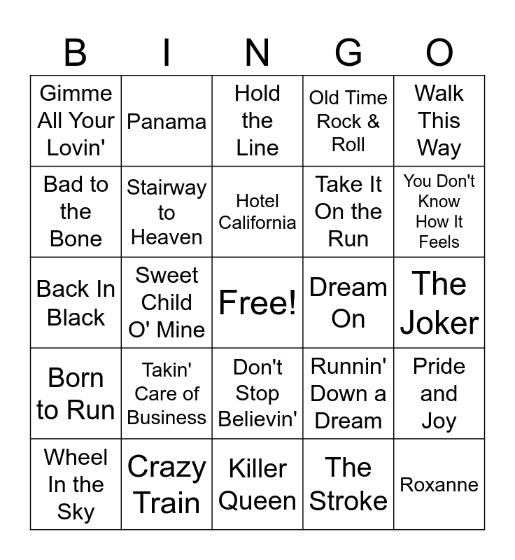 This bingo card has a free space and 40 words: Bohemian Rhapsody, Back In Black, Dreams, Stairway to Heaven, Crazy Train, Don't Stop Believin', Hotel California, Wish You Were Here, Walk This Way, Born to Run, Sweet Child O' Mine, Old Time Rock & Roll, Roxanne, The Joker, Dream On, Takin' Care of Business, Black Magic Woman, Gimme All Your Lovin', Cold As Ice, Hold the Line, Pride and Joy, The Stroke, Take It On the Run, Bad to the Bone, Big Shot, Turn Me Loose, Comfortably Numb, Cult of Personality, Burnin' for You, You Give Love a Bad Name, Bad Medicine, Wheel In the Sky, Blue Collar Man, Runnin' Down a Dream, You Don't Know How It Feels, Killer Queen, Smells Like Teen Spirit, Ain't Talkin' 'Bout Love, Panama and Photograph.