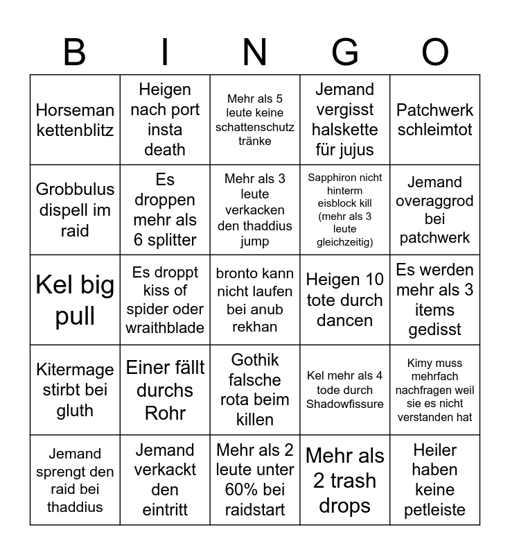 This bingo card has a free space and 24 words: Einer fällt durchs Rohr, Jemand verkackt den eintritt, Mehr als 3 leute verkacken den thaddius jump, Jemand sprengt den raid bei thaddius, Patchwerk schleimtot, Horseman kettenblitz, Grobbulus dispell im raid, Heigen nach port insta death, Heigen 10 tote durch dancen, Gothik falsche rota beim killen, Sapphiron nicht hinterm eisblock kill (mehr als 3 leute gleichzeitig), Kel big pull, Kel mehr als 4 tode durch Shadowfissure, Kimy muss mehrfach nachfragen weil sie es nicht verstanden hat, Es droppen mehr als 6 splitter, Mehr als 2 trash drops, Es werden mehr als 3 items gedisst, Mehr als 5 leute keine schattenschutz tränke, Jemand overaggrod bei patchwerk, Es droppt kiss of spider oder wraithblade, Heiler haben keine petleiste, Kitermage stirbt bei gluth, Jemand vergisst halskette für jujus and Mehr als 2 leute unter 60% bei raidstart.