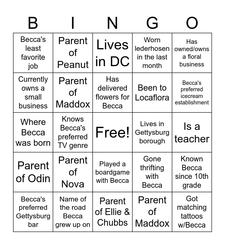 This bingo card has a free space and 37 words: Has gone to a concert with Becca, Works in the floral industry, Was roommates with Becca, Parent of Maddox, Known Becca since 10th grade, Parent of Nova, Has delivered flowers for Becca, Knows the name of either college Becca went to, Has owned/owns a floral business, Is a woodworker, Knows Becca's preferred TV genre, Worn lederhosen in the last month, Got matching tattoos w/Becca, Is a teacher, Currently owns a small business, Parent of Odin, Name all of Becca's siblings, Lives in DC, Played a boardgame with Becca, Lives in Gettysburg borough, Becca's least favorite job, Becca's preferred icecream establishment, Becca's preferred Gettysburg bar, Parent of Ellie & Chubbs, Parent of Roy & Bo, Parent of Maddox, Parent of Peanut, Knows how old Becca is turning, Parent of Sunny, Knows what Becca wants for next tattoo, Worked at Waldo's, Name of the road Becca grew up on, Where Becca was born, Knows 1 of Becca's Harrisburg jobs, Gone thrifting with Becca, Been to Locaflora and Parent of Nico.