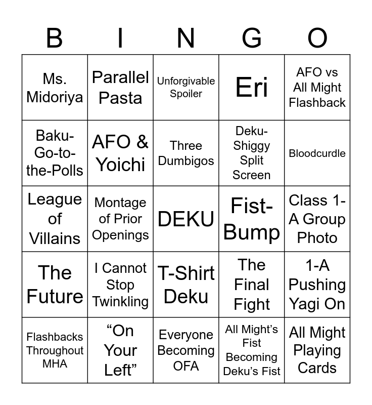 This bingo card has a free space and 24 words: I Cannot Stop Twinkling, “On Your Left”, Three Dumbigos, Flashbacks Throughout MHA, AFO vs All Might Flashback, Ms. Midoriya, Baku-Go-to-the-Polls, Parallel Pasta, Fist-Bump, T-Shirt Deku, Deku-Shiggy Split Screen, League of Villains, The Final Fight, 1-A Pushing Yagi On, AFO & Yoichi, All Might’s Fist Becoming Deku’s Fist, Class 1-A Group Photo, Unforgivable Spoiler, Bloodcurdle, Montage of Prior Openings, All Might Playing Cards, The Future, Eri and Everyone Becoming OFA.