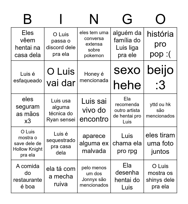 This bingo card has a free space and 24 words: Luis é sequestrado pra casa dela, ela tá com a mecha ruiva, Honey é mencionada, A comida do restaurante é boa, história pro pop :(, Eles vêem hentai na casa dela, Luis é esfaqueado, O Luis passa o discord dele pra ela, Ela recomenda outro artista de hentai pro Luis, aparece alguma ex malvada, sexo hehe, eles seguram as mãos x3, Luis chama ela pro rpg, eles tiram uma foto juntos, O Luis vai dar, Ela desenha hentai do Luis, yttd ou hk são mencionados, eles tem uma conversa extensa sobre pokemon, beijo :3, Luis usa alguma técnica do Ryan sensei, O Luis mostra os shinys dele pra ela, O Luis mostra o save dele de Hollow Knight pra ela, alguém da família do Luis liga pra ele and pelo menos um dos Jonnyx são mencionados.
