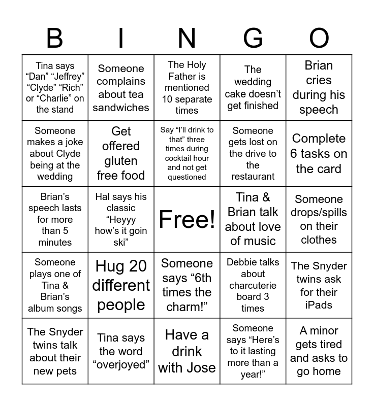 This bingo card has a free space and 26 words: Someone says “6th times the charm!”, Someone says “Here’s to it lasting more than a year!”, Say “I’ll drink to that” three times during cocktail hour and not get questioned, Tina says the word “overjoyed”, Brian cries during his speech, Tina says “Dan” “Jeffrey” “Clyde” “Rich” or “Charlie” on the stand, Someone makes a joke about Clyde being at the wedding, Someone complains about tea sandwiches, Someone drops/spills on their clothes, Debbie talks about charcuterie board 3 times, Someone gets lost on the drive to the restaurant, Brian’s speech lasts for more than 5 minutes, The Snyder twins ask for their iPads, The Snyder twins talk about their new pets, Hal says his classic “Heyyy how’s it goin ski”, Someone eats 3 slices of wedding cake on their own, The wedding cake doesn’t get finished, Someone plays one of Tina & Brian’s album songs, The Holy Father is mentioned 10 separate times, A minor gets tired and asks to go home, Complete 6 tasks on the card, Have a drink with Jose, Tina & Brian talk about love of music, Hug 20 different people, Get offered gluten free food and Get Tina to laugh.