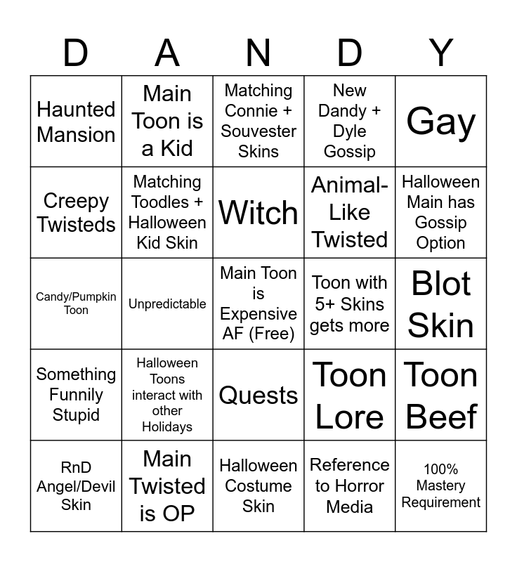 This bingo card has a free space and 24 words: RnD Angel/Devil Skin, Halloween Toons interact with other Holidays, Witch, Reference to Horror Media, Gay, Haunted Mansion, Main Toon is a Kid, Matching Connie + Souvester Skins, Toon with 5+ Skins gets more, Blot Skin, Candy/Pumpkin Toon, Matching Toodles + Halloween Kid Skin, Toon Lore, Toon Beef, Creepy Twisteds, Main Twisted is OP, Halloween Costume Skin, New Dandy + Dyle Gossip, Halloween Main has Gossip Option, Something Funnily Stupid, Unpredictable, Quests, Animal-Like Twisted and 100% Mastery Requirement.