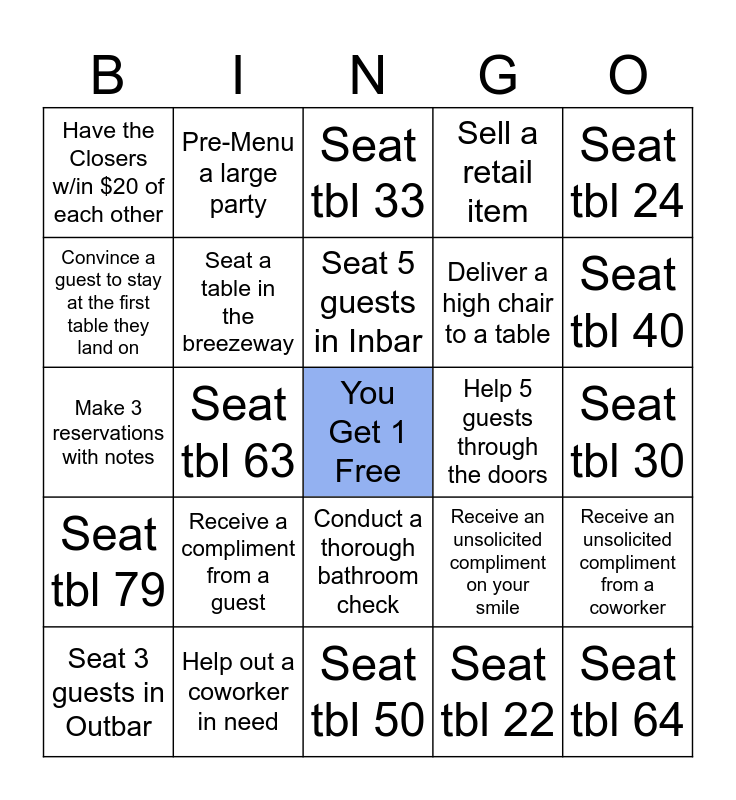 This bingo card has a free space and 24 words: Receive a compliment from a guest, Help out a coworker in need, Seat 5 guests in Inbar, Seat 3 guests in Outbar, Seat tbl 24, Have the Closers w/in $20 of each other, Convince a guest to stay at the first table they land on, Pre-Menu a large party, Help 5 guests through the doors, Conduct a thorough bathroom check, Deliver a high chair to a table, Make 3 reservations with notes, Receive an unsolicited compliment on your smile, Receive an unsolicited compliment from a coworker, Seat a table in the breezeway, Seat tbl 22, Seat tbl 30, Seat tbl 33, Seat tbl 40, Seat tbl 63, Seat tbl 64, Seat tbl 79, Sell a retail item and Seat tbl 50.
