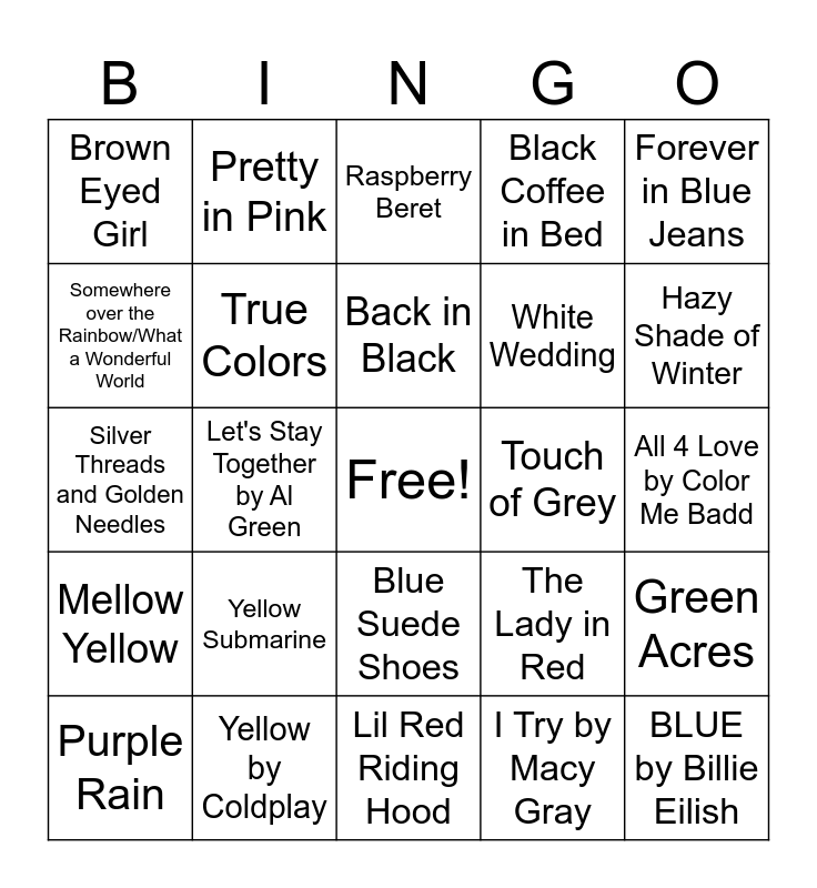 This bingo card has a free space and 25 words: Yellow Submarine, Lil Red Riding Hood, Back in Black, Purple Rain, Forever in Blue Jeans, Brown Eyed Girl, Somewhere over the Rainbow/What a Wonderful World, Pretty in Pink, Touch of Grey, Blue Suede Shoes, White Wedding, Silver Threads and Golden Needles, The Lady in Red, Green Acres, True Colors, Colors of the Wind, All 4 Love by Color Me Badd, Raspberry Beret, Hazy Shade of Winter, Let's Stay Together by Al Green, BLUE by Billie Eilish, Yellow by Coldplay, Mellow Yellow, Black Coffee in Bed and I Try by Macy Gray.