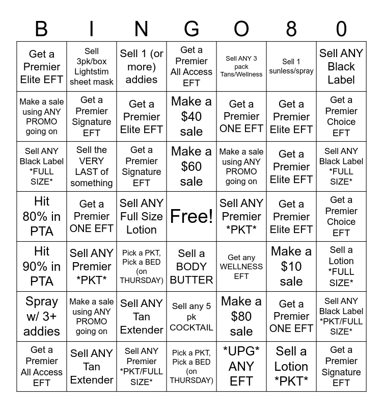 This bingo card has a free space and 131 words: Sell a Lightstim sheet mask, Sell 3pk/box Lightstim sheet mask, Sell any 5 pk COCKTAIL, Sell City Lips, Sell a CANDLE, Sell any TELETIES, Sell the VERY LAST of something, Sell ANY Premier *FULL SIZE*, Sell ANY Premier *PKT*, Sell ANY Premier *PKT/FULL SIZE*, Sell ANY Black Label *FULL SIZE*, Sell ANY Black Label *PKT*, Sell ANY Black Label *PKT/FULL SIZE*, Sell ANY Black Label *FULL SIZE*, Sell ANY Spray Your Way, Sell ANY Black Label, Sell ANY Full Size Lotion, *UPG*- ANY EFT, Get a Premier All Access EFT, Get a Premier All Access EFT, Get a Premier Elite EFT, Get a Premier Elite EFT, Get a Premier Signature EFT, Get a Premier Signature EFT, Get a Premier Choice EFT, Get a Premier Choice EFT, Get a Premier ONE EFT, Get a Premier ONE EFT, Sell 1 sunless/spray, Get a Premier All Access EFT, Get a Premier All Access EFT, Get a Premier Elite EFT, Get a Premier Elite EFT, Get a Premier Signature EFT, Get a Premier Signature EFT, Get a Premier Choice EFT, Get a Premier Choice EFT, Get a Premier ONE EFT, Get a Premier ONE EFT, Sell a B1G1 SPRAY, Make a sale using ANY PROMO going on, Sell L'obsidiennex, Sell City Lips, Sell a CANDLE, Sell any TELETIES, Sell the VERY LAST of something, Sell ANY Full Size FACE Lotion, Sell a BODY BUTTER, Sell ANY RESTORED product, Sell ANY Tan Extender, Sell a Lotion *FULL SIZE*, Sell a Lotion *PKT*, Sell a Lotion *FULL SIZE*, Sell a Lotion *РКТ*, Sell ANY lotion PKT, Hit 70% in PTA, Hit 70% in PRA, Hit 75% in PTA, Hit 75% in PRA, Hit 80% in PTA, Hit 80% in PRA, Hit 90% in PTA, Hit 90% in PRA, Hit 100% in PTA, Hit 100 % in PRA, Make a $10 sale, Make a $15 sale, Make a $20 sale, Make a $40 sale, Make a $50 sale, Make a $60 sale, Make a $70 sale, Make a $80 sale, Make a $90 sale, Make a $100+ sale, Make a $150 sale, Make a sale, Get any WELLNESS EFT, Get ANY PIF Qtr/Yr, Get a Premier All Access EFT, Get a Premier All Access EFT, Get a Premier Elite EFT, Get a Premier Elite EFT, Get a Premier Signature EFT, Get a Premier Signature EFT, Get a Premier Choice EFT, Get a Premier Choice EFT, Get a Premier ONE EFT, Get a Premier ONE EFT, Get 4 EFT upgrades (same day), Get 3 EFT upgrades (same day), *UPG* ANY EFT, *UPG* ANY EFT, Sell any 2 pack sessions, Pick a PKT, Pick a BED (on THURSDAY), Pick a PKT, Pick a BED (on THURSDAY), Sell ANY 3 pack Tans/Wellness, Sell ANY 10 pack Tans/Wellness, Sell 1 sunless/spray, Spray w/ 2+ addies, Spray w/ 3+ addies, Sell 1 (or more) addies, Sell 3+ addies, Sell 5+ addies, Sell ANY Premier *PKT*, Sell ANY Premier *PKT/FULL SIZE*, Sell ANY Black Label *FULL SIZE*, Sell 2 Black Label Primer Bottles, Sell ANY Black Label *FULL SIZE*, Sell ANY Spray Your Way, Sell ANY Black Label, Sell ANY Full Size Lotion, Sell ANY Full Size FACE Lotion, Sell ANY RESTORED, Sell ANY Tan Extender, Sell a Lotion *FULL SIZE*, Sell a Lotion *PKT*, Sell an Lotion *FULL SIZE*, Sell a Lotion *PKT*, Sell a Lotion *FULL SIZE*, Sell Lotion *PKT*, Sell 2 lotion PKT’s (same day), Make a sale using ANY PROMO going on, Make a sale using ANY PROMO going on, Make a sale using ANY PROMO going on, Make a sale using ANY PROMO going on, Make a sale using ANY PROMO going on, Get an EFT unfreeze, Get an EFT unfreeze, Get a Stay & Save and Get a Stay & Save.