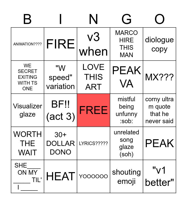 This bingo card has a free space and 24 words: 30+ DOLLAR DONO, HEAT, LOVE THIS ART, SHE____ ON MY _____ TIL' I _____, diologue copy, ANIMATION????, WE SECRET EXITING WITH TS ONE, FIRE, mistful being unfunny :sob:, LYRICS?????, PEAK VA, Visualizer glaze, unrelated song glaze (soh), PEAK, "W speed" variation, shouting emoji, corny ultra m quote that he never said, v3 when, MX???, BF!!(act 3), "v1 better", WORTH THE WAIT, MARCO HIRE THIS MAN and YOOOOOO.