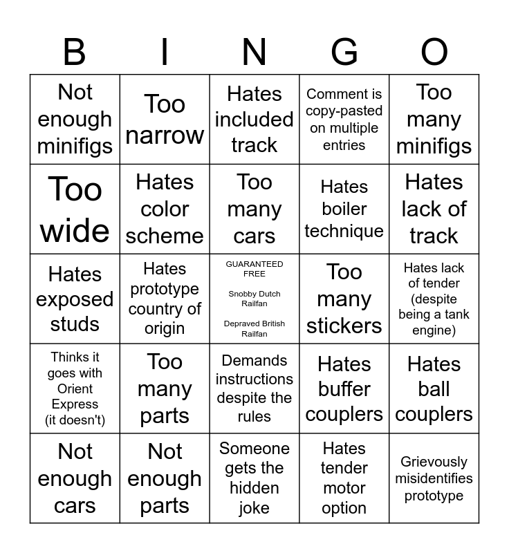 This bingo card has a free space and 24 words: Too many parts, Not enough parts, Too many cars, Not enough cars, Too many minifigs, Not enough minifigs, Too wide, Too narrow, Too many stickers, Demands instructions despite the rules, Hates boiler technique, Hates exposed studs, Hates buffer couplers, Hates ball couplers, Hates color scheme, Hates tender motor option, Hates lack of tender (despite being a tank engine), Hates included track, Hates lack of track, Hates prototype country of origin, Grievously misidentifies prototype, Thinks it goes with Orient Express (it doesn't), Comment is copy-pasted on multiple entries and Someone gets the hidden joke.