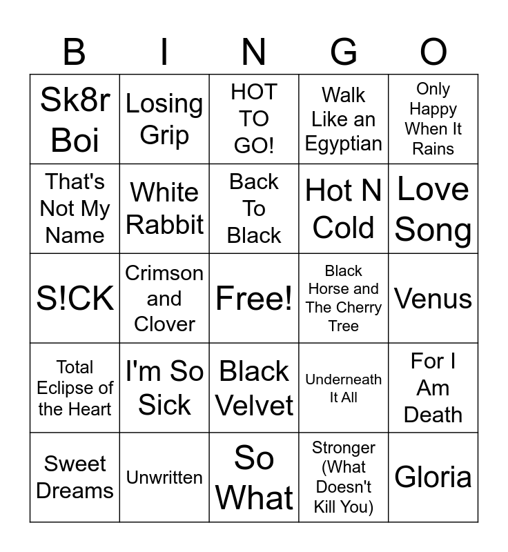 This bingo card has a free space and 39 words: I Love Rock 'N Roll, Edge of Seventeen, Piece of My Heart, White Rabbit, Sweet Dreams, Black Velvet, Back To Black, Time After Time, Only Happy When It Rains, Total Eclipse of the Heart, Crimson and Clover, Walk Like an Egyptian, Gloria, Venus, Black Horse and The Cherry Tree, I'm So Sick, Still into You, Sk8r Boi, All I Wanted, Underneath It All, That's Not My Name, So What, Hot N Cold, Love Song, A Thousand Miles, Sober, Pieces Of Me, This Kiss, My Happy Ending, Losing Grip, All You Wanted, That's What You Get, HOT TO GO!, Unwritten, Stronger (What Doesn't Kill You), i hope ur miserable until ur dead, For I Am Death, S!CK and One More Hour.