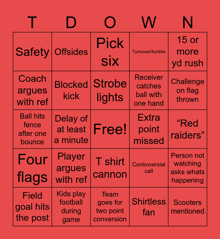 This bingo card has a free space and 36 words: Nwc touchdown, Hastings touchdown, Two point conversion, Blocked kick, Controversial call, Four flags, Strobe lights, 20 yd or more field goal, 15 or more yd rush, Incomplete pass on 3rd down, Delay of at least a minute, Turnover/fumble, Sack on qb, Extra point missed, Challenge on flag thrown, Safety, Booing from crowd, Player argues with ref, Scooters mentioned, Pick six, “Red raiders”, Person not watching asks whats happening, Kids play football during game, Field goal hits the post, Team goes for two point conversion, Offsides, Ball hits fence after one bounce, Hail mary, Receiver catches ball with one hand, Coach argues with ref, Coach throws something down, End zone celebration, Shirtless fan, T shirt cannon, Fan wins prize and Fans chant defense.