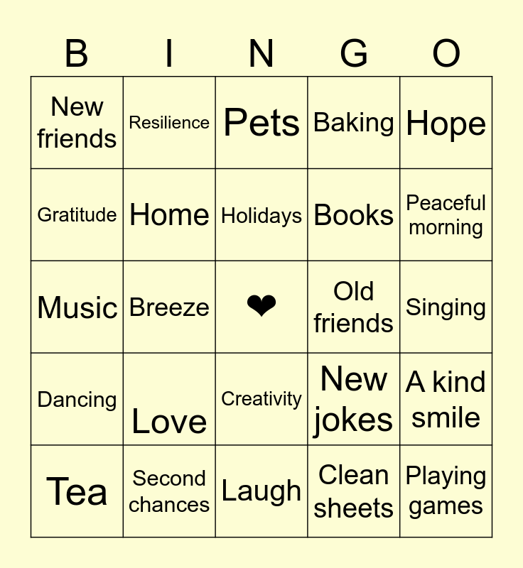 This bingo card has a free space and 94 words: Family, Friends, Laugh, Music, Sunshine, Nature, Coffee, Tea, Good health, Hugs, Warm blanket, Smile, Happy memories, Books, Comfort, Hope, Pets, Kindness, Flowers, Favorite food, New foods, Rest, Morning light, Joy, Love, Home, Neighbors, Nurses, Doctors, Learning, Second chances, Creativity, Humor, Mindfulness, Resilience, Dreams, Purpose, Serenity, Holidays, New jokes, Music, Dancing, Singing, Movies, Playing games, Meet new people, Birthdays, A good meal, Fresh air, Warm socks, Nap, Clean sheets, Morning light, Evening quiet, Rain, Snow, Birds, Trees, Ocean, Mountains, Breeze, Stars, Garden, Moon, Peace, Healing, Faith, Patience, Gratitude, Trust, Calm, Strength, Wisdom, Purpose, Baking, Warm bath, Showers, Peaceful morning, A kind smile, Helping hands, Phone calls, Cards and letters, Someone who listens, Old friends, New friends, Community, Blue sky, A walk outside, Rainbow, Autumn Leaves, Crisp morning, Courage, Understanding and Blessings.