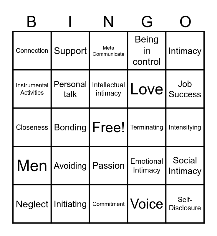 This bingo card has a free space and 27 words: Emotional Intimacy, Openness, Love, Commitment, Instrumental Activities, Meta Communicate, Support, Men, Terminating, Social Intimacy, Closeness, Being in control, Neglect, Initiating, Job Success, Someone less intelligent, Personal talk, Intellectual intimacy, Avoiding, Connection, Intensifying, Voice, Bonding, Self- Disclosure, Passion, Intimacy and Autonomy.