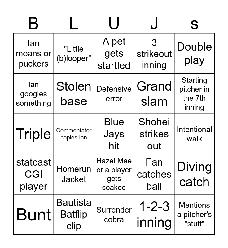 This bingo card has a free space and 24 words: Homerun Jacket, Bautista Batflip clip, Defensive error, Bunt, Double play, Ian moans or puckers, Ian googles something, "Little (b)looper", Shohei strikes out, Hazel Mae or a player gets soaked, Grand slam, Triple, Fan catches ball, Diving catch, Stolen base, 1-2-3 inning, Intentional walk, A pet gets startled, Starting pitcher in the 7th inning, Commentator copies Ian, Mentions a pitcher's "stuff", statcast CGI player, 3 strikeout inning and Surrender cobra.