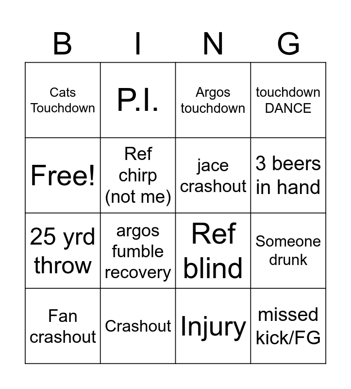 This bingo card has 16 words: Crashout, Someone drunk, Argos touchdown, Cats Touchdown, 25 yrd throw, P.I., Ref blind, Injury, Free!, Ref chirp (not me), Fan crashout, touchdown DANCE, argos fumble recovery, 3 beers in hand, jace crashout and missed kick/FG.